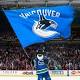 VANCOUVER, BC - APRIL 11: Fin, the Vancouver Canucks' mascot, salutes the fans after their game against the Edmonton Oilers at Rogers Arena April 11, 2015 in Vancouver, British Columbia, Canada. Vancouver won 6-5 in overtime. (Photo by Jeff ...